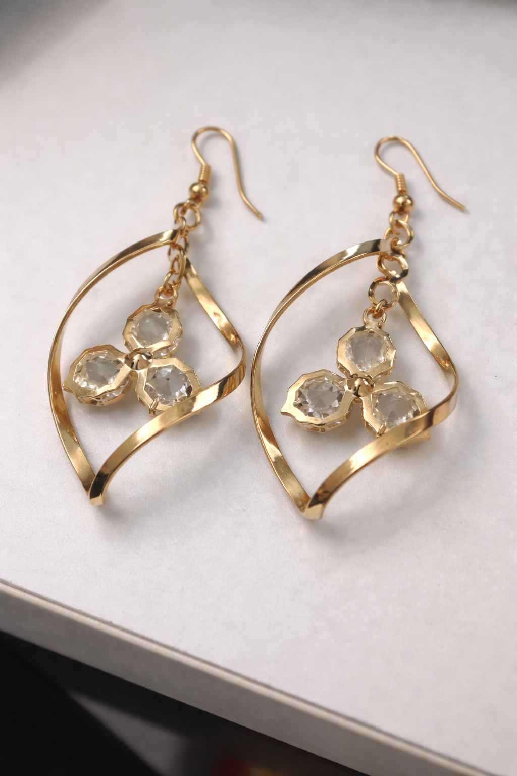Add a touch of graceful sparkle to your look with these elegant gold-tone crystal drop earrings. Designed with a modern twisted teardrop frame, each earring features a delicate trio of shimmering crystals arranged in a floral cluster, creating a refined and feminine appeal. Lightweight and comfortable for all-day wear, these earrings are perfect for daily styling, festive occasions, parties, and gifting. Their subtle shine and classy design effortlessly complement both ethnic and western outfits, making them a versatile addition to your jewellery collection.