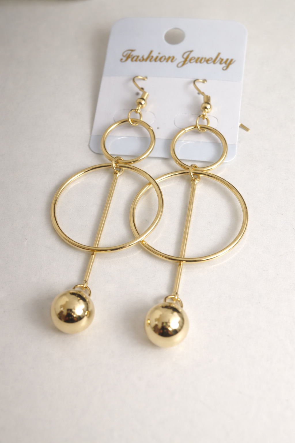 Add a touch of modern elegance to your look with these stunning Golden Orbit Drop Earrings. Designed with a sleek geometric pattern, the earrings feature interlinked circular frames with a delicate vertical bar and polished gold bead drop, creating a graceful and eye-catching movement. Lightweight and comfortable for all-day wear, these fashion earrings are perfect for casual outings, office wear, parties, and festive occasions. Their minimal yet stylish design makes them easy to pair with both western and traditional outfits.